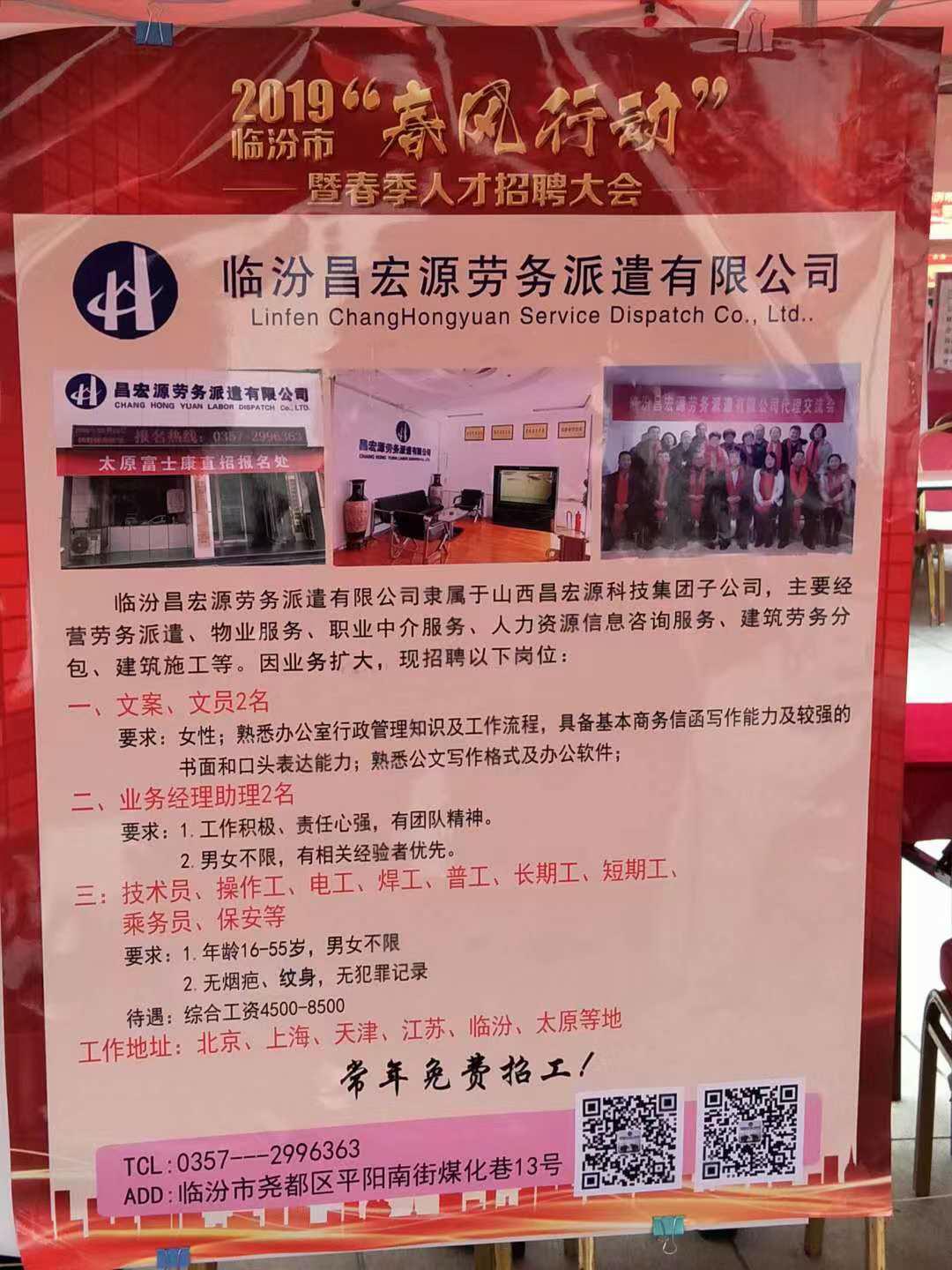 近日,昌宏源勞務(wù)派遣有限公司分別在臨汾市九州廣場和襄汾丁陶廣場舉辦了“2019年春季人才招聘會(huì)”,公司全體員工參與了本次招聘會(huì)。