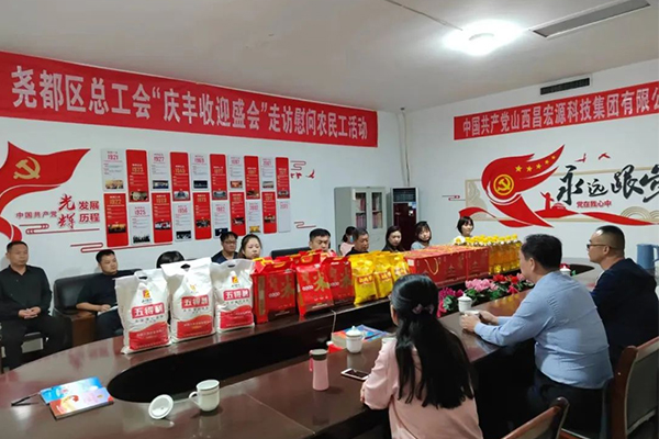 2022年是黨的二十大召開之年,是進(jìn)入全 面建設(shè)社會(huì)主義現(xiàn)代化國(guó) 家、向第二個(gè)百年奮斗目標(biāo)進(jìn)軍新征程的重要一年,也是鄉(xiāng)村振興全 面展開的關(guān)鍵之年。為慶祝第五個(gè)“中國(guó)農(nóng)民豐收節(jié)”,9月28日下午,臨汾市堯都區(qū)總工會(huì)開展以“慶豐收 迎盛會(huì)”為主題的慰問農(nóng)民工活動(dòng),區(qū)總工會(huì)主席秦奇杰等一行人來到我們山西昌宏源人力資源股份有限公司對(duì)13名農(nóng)民工進(jìn)行走訪慰問,為我們送來米、面、油、小米、五谷雜糧等慰問品。