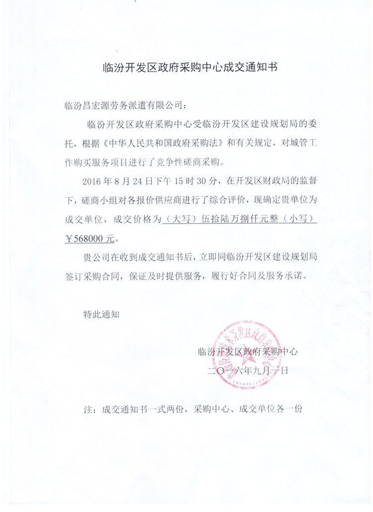 熱烈祝賀!臨汾昌宏源勞務(wù)派遣有限公司2016年8月24日在臨汾開發(fā)區(qū)建設(shè)規(guī)劃局服務(wù)項目中成功中標(biāo)。