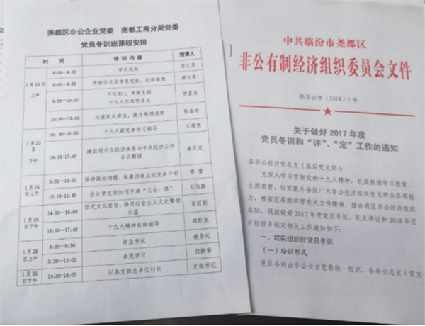 2018年1月23日,中共臨汾市堯都區(qū)非公有制經(jīng)濟(jì)組織委員會(huì),開展關(guān)于做好2017年度黨員冬訓(xùn)和“評(píng)”、“定”工作學(xué)習(xí)會(huì)議,我公司積極參與了學(xué)習(xí),并在進(jìn)一步貫徹落實(shí)中。